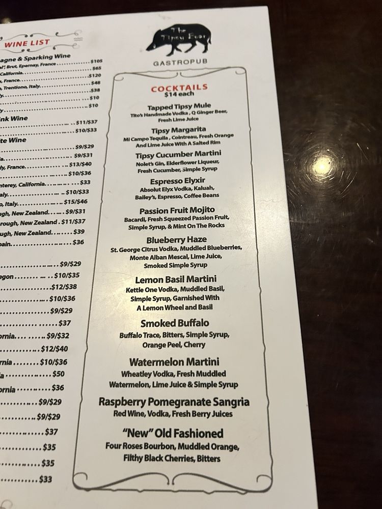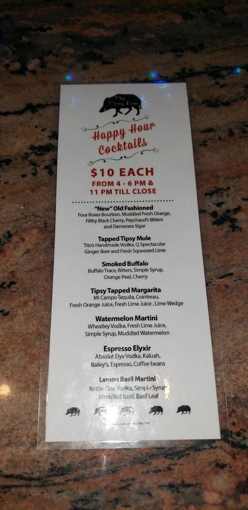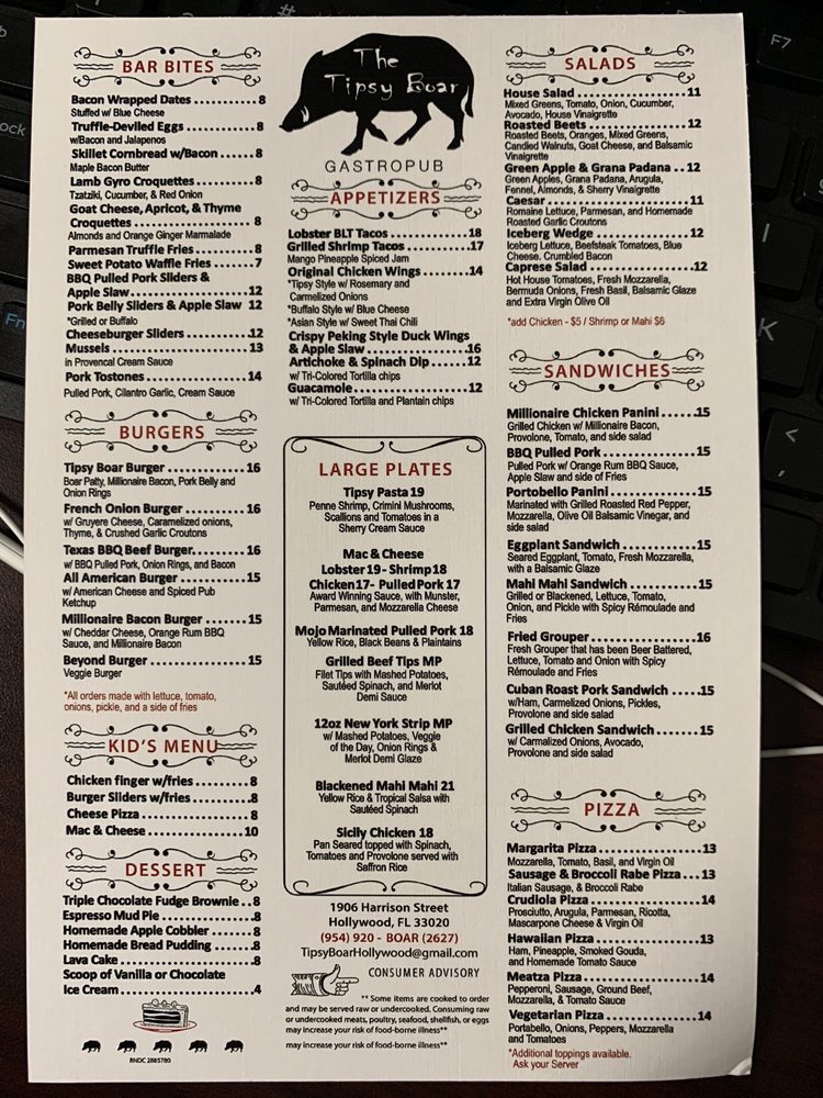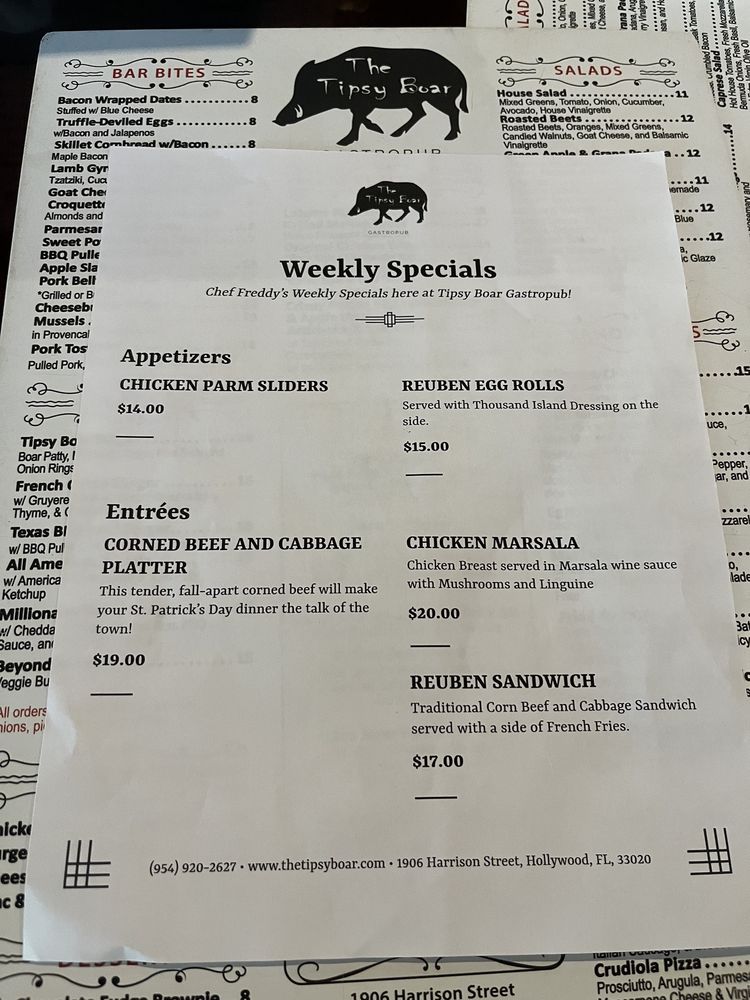 Introducing The Tipsy Boar, a trendy gastropub in Hollywood, FL, known for its wide range of food selections, including burgers and New American cuisine. The menu features appetizers like Artichoke & Spinach Dip and Asian Style Chicken Wings, along with unique bar bites such as Bacon Wrapped Dates and Lamb Gyro Croquettes. Salads like the Green Apple & Grana Padana Salad showcase fresh ingredients and flavorful combinations. Customers rave about the attentive service, inviting atmosphere, and delicious food options. Reviews highlight the friendly staff, clean environment, and extensive beer selection. Whether you're looking for a casual lunch spot or a late-night hangout, The Tipsy Boar has something for everyone. With options for pescatarians, vegetarians, and vegans, this gastropub is a must-visit for food enthusiasts seeking a memorable dining experience.